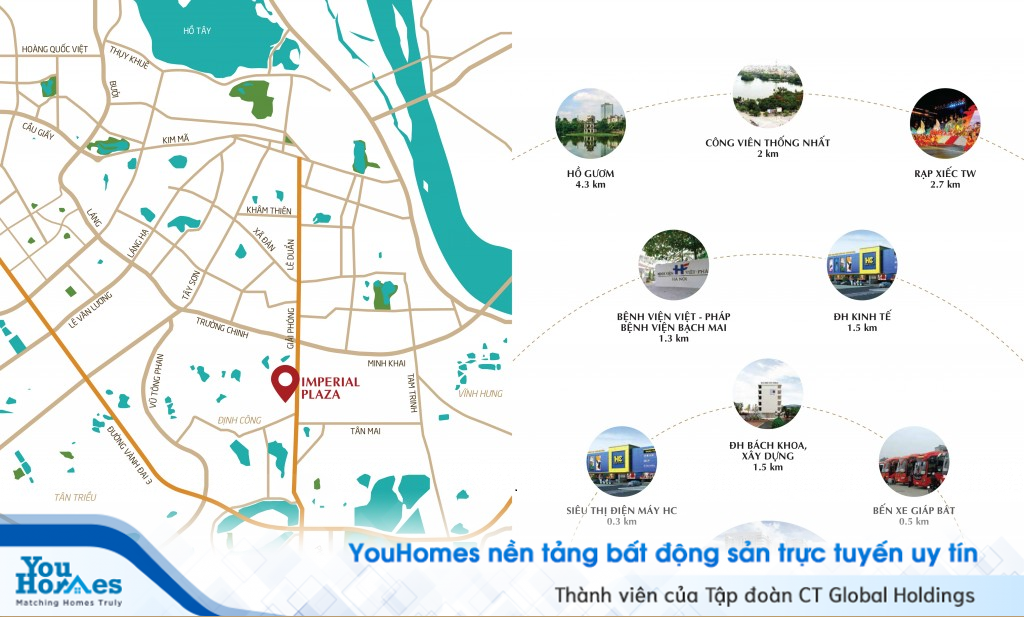 Dự án Imperial Plaza sở hữu vị trí vàng với 2 mặt tiền trên đường Giải Phóng và Định Công. Theo quy hoạch, dự án được tiếp cận bằng 3 tuyến đường: Giải Phóng – Định Công và tuyến đường Nguyễn Văn Trỗi đang được mở rộng. Trong tương lai, cư dân Imperial Plaza sẽ kết nối tới Ngã Tư Sở chỉ trong vòng 5 phút lái xe. Hơn nữa dự án còn có vị trí đắc địa tại cửa ngõ phía Nam thủ đô, gần Quốc lộ 1A thuận tiện giao thông với các tỉnh phía Nam Hà Nội, kết nối với các tỉnh phía Bắc Hà Nội thông qua tuyến đường giao thông gần đường vành đai.