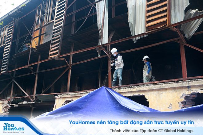 Công nhân tiến hành quây bạt tại Khu vực Nhà máy