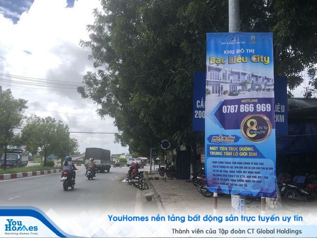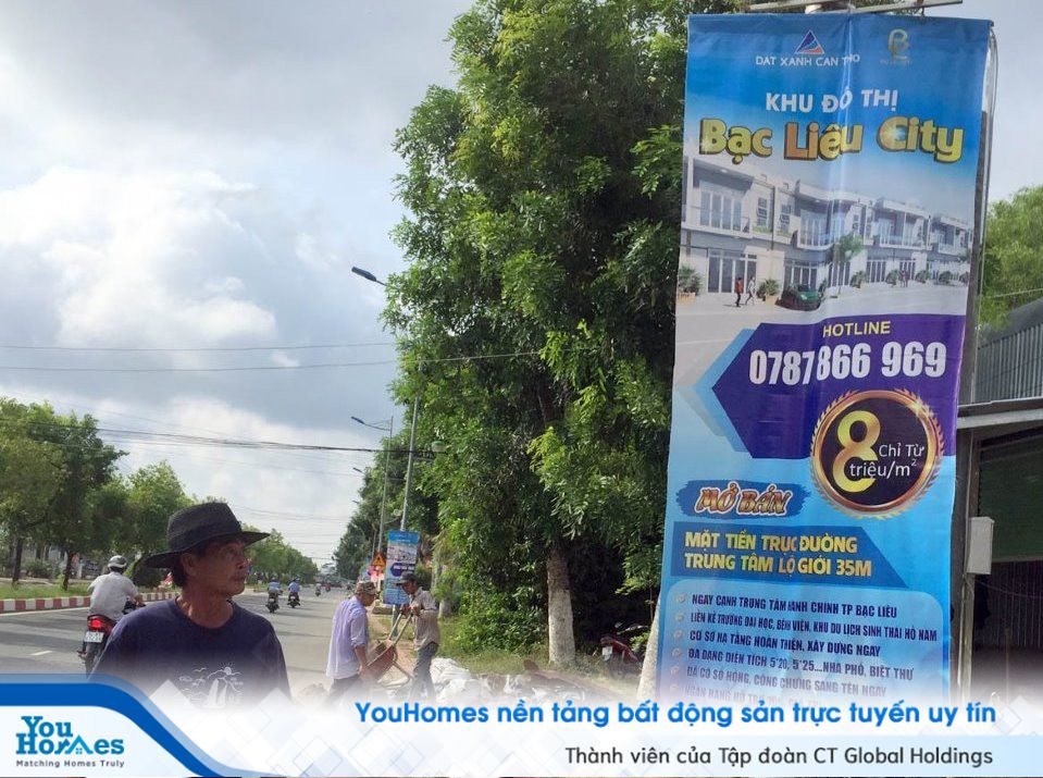 Tấm quảng cáo được treo mở bán đất dự án trên đường Trần Phú, TP Bạc Liêu.Theo ghi nhận của phóng viên và phản ánh của người dân, từ ngày 11-8, dọc theo các tuyến đường Trần Phú, Tôn Đức Thắng… ở trung tâm TP Bạc Liêu xuất hiện hàng loạt tấm quảng cáo rao bán đất dự án Khu đô thị Bạc Liêu City. Những tấm quảng cáo này là của Công ty CP dịch vụ Đất Xanh Cần Thơ (Công ty Đất Xanh Cần Thơ) treo, nội dung dự án có tên Khu đô thị Bạc Liêu City, mở bán đất mặt tiền trục đường trung tâm lộ giới 35m, giá chỉ từ 8 triệu đồng/m2, nằm cạnh Trung tâm hành chính TP Bạc Liêu; liền kề trường đại học, bệnh viện, khu du lịch sinh thái Hồ Nam; cơ sở hạ tầng hoàn thiện, xây dựng ngay; đã có sổ hồng, công chứng sang tên ngay; ngân hàng hỗ trợ 70% giá trị…