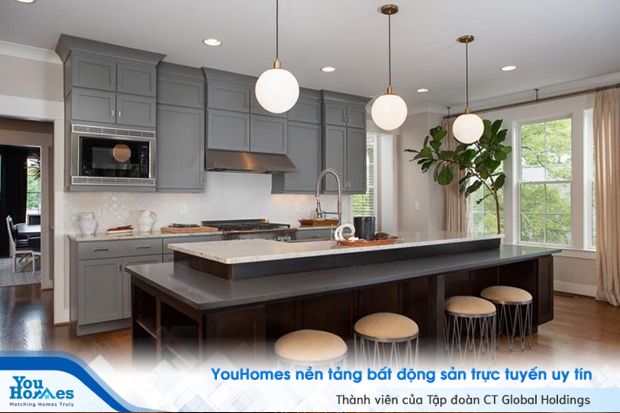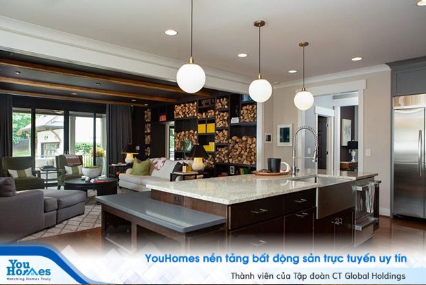 Nhà bếp có tủ lớn và các thiết bị kiểu dáng đẹp ngay cạnh phòng khách.