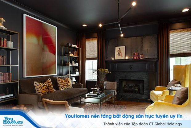 Một phòng khách khác kết hợp các ghế bành màu vàng và các vật dụng in đậm để làm sống động các bức tường tối.