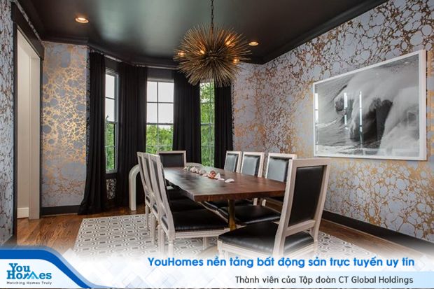 Phòng ăn ấn tượng với tấm thảm lát sàn và những họa tiết của các bức tường.