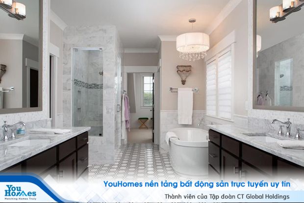 Giống như phòng ngủ, phòng tắm tạo cảm giác tươi mới, thư giãn trong không gian rộng.