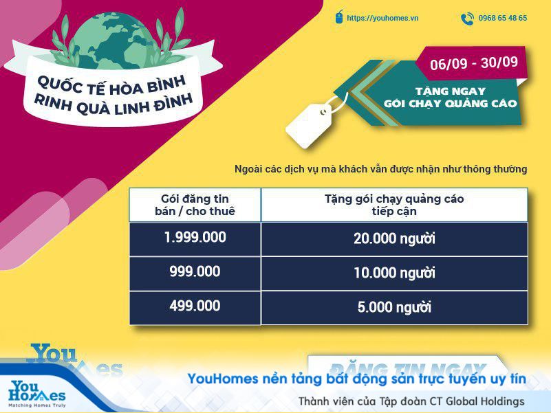 Nhân dịp Ngày Quốc tế Hòa bình 21/9 sắp tới, YouHomes sẽ có chính sách ưu đãi đặc biệt và chỉ có duy nhất tại YouHomes cho các khách hàng đăng tin từ 06/09 đến 30/09