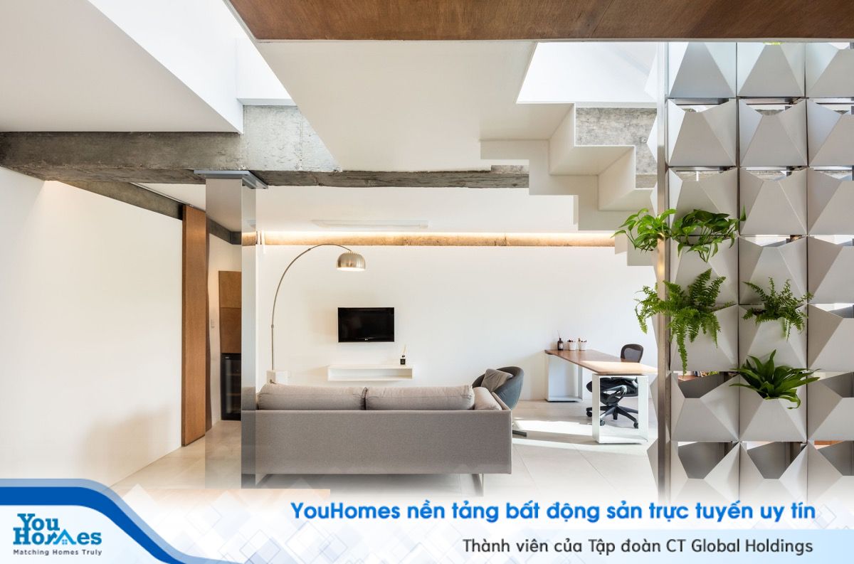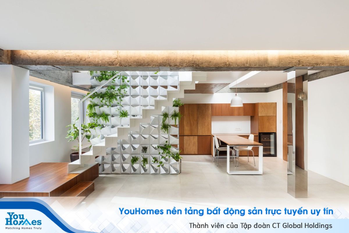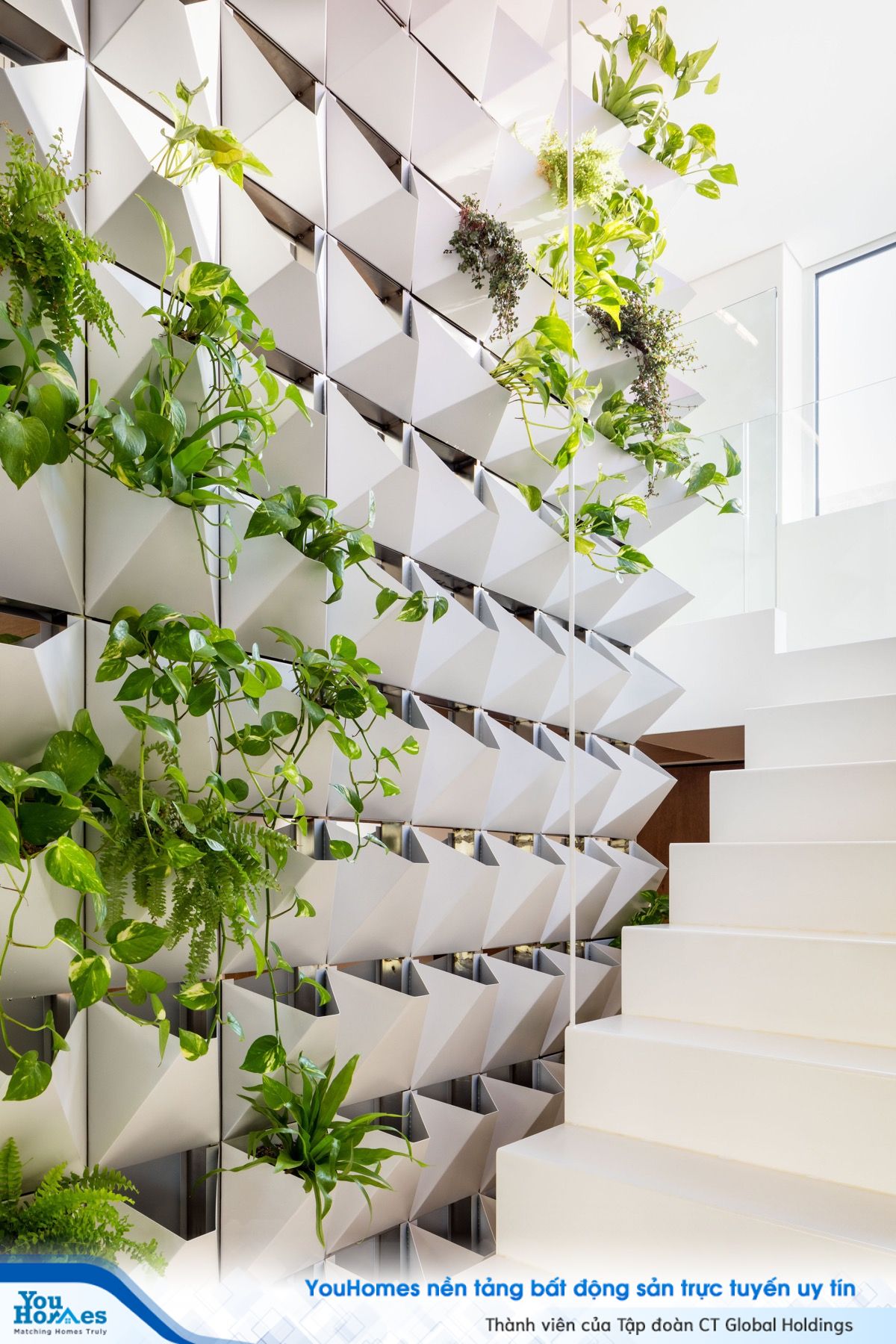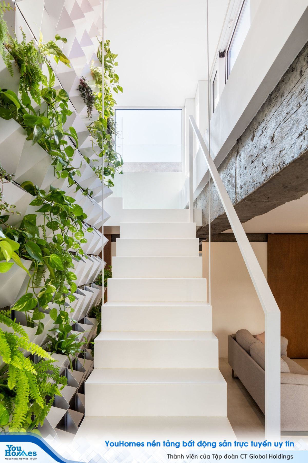 Một bức tường với nhiều cây xanh làm vách ngăn giữa các không gian chính là điểm nhấn ấn tượng của căn nhà.