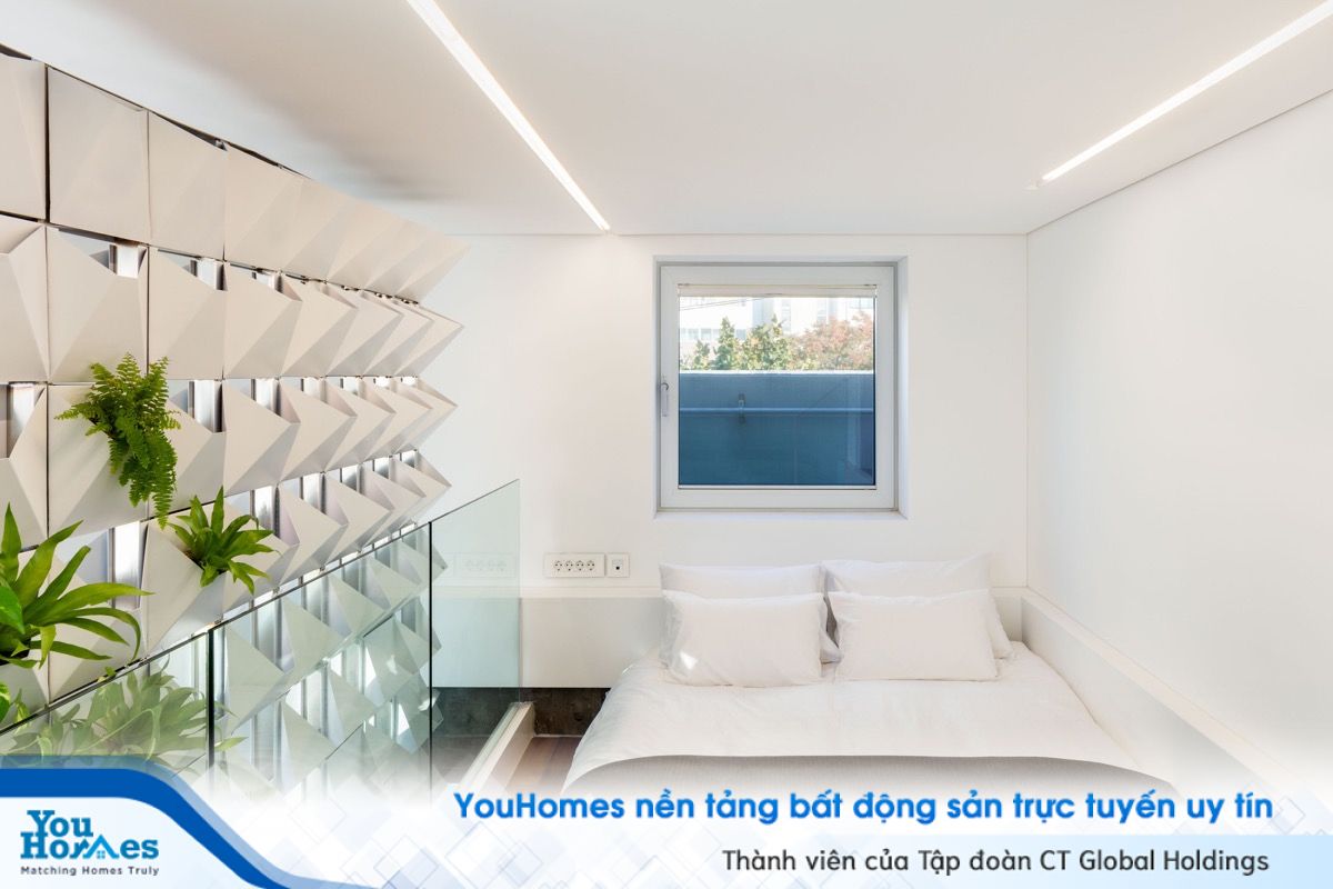 Nơi mà khu vườn thẳng đứng trong nhà chạm tới trần nhà, tại tầng hai của ngôi nhà, có một phòng ngủ màu trắng nằm trên một cấu trúc gác lửng. Lan can kính trong suốt giữ cho bức tường màu xanh lá cây hoàn toàn nhìn ra bên cạnh giường, trong khi làm cho an toàn khoảng cách giữa các cạnh của nền lửng và tường. Một cánh cửa dẫn ra khỏi phòng ngủ đến một khu vực lưu trữ hẹp và vào một phòng tắm riêng.