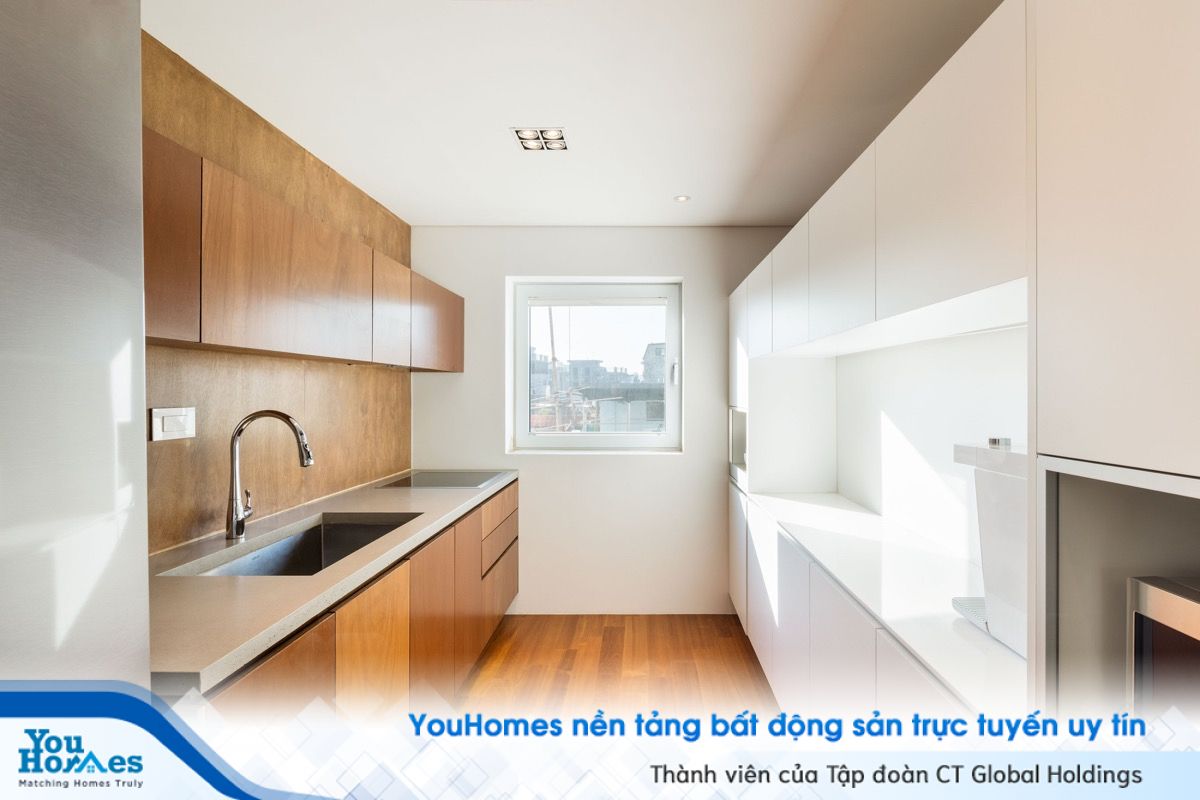 Cuối tầng dưới, là nhà bếp bằng gỗ và trắng. Khu vực bếp có thiết kế giúp ánh sáng luôn tràn ngập căn phòng.