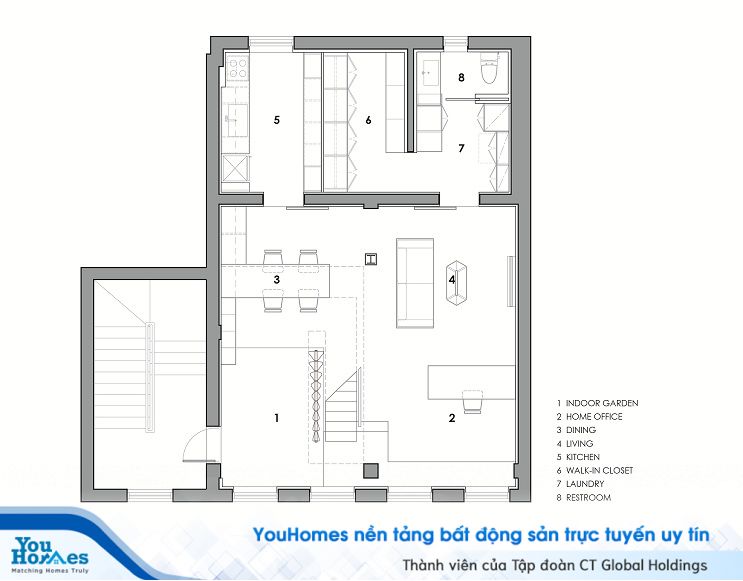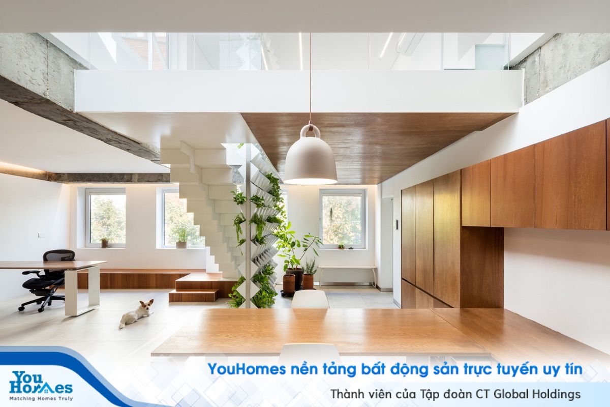 Một cái cột được phủ gương hỗ trợ cho cấu trúc phòng khách trong không gian mở. Bậc gỗ dẫn lối vào thiết kế cầu thang mở kết hợp với bức tường trắng thẳng đứng tạo sự thanh lịch tinh tế cho căn nhà.