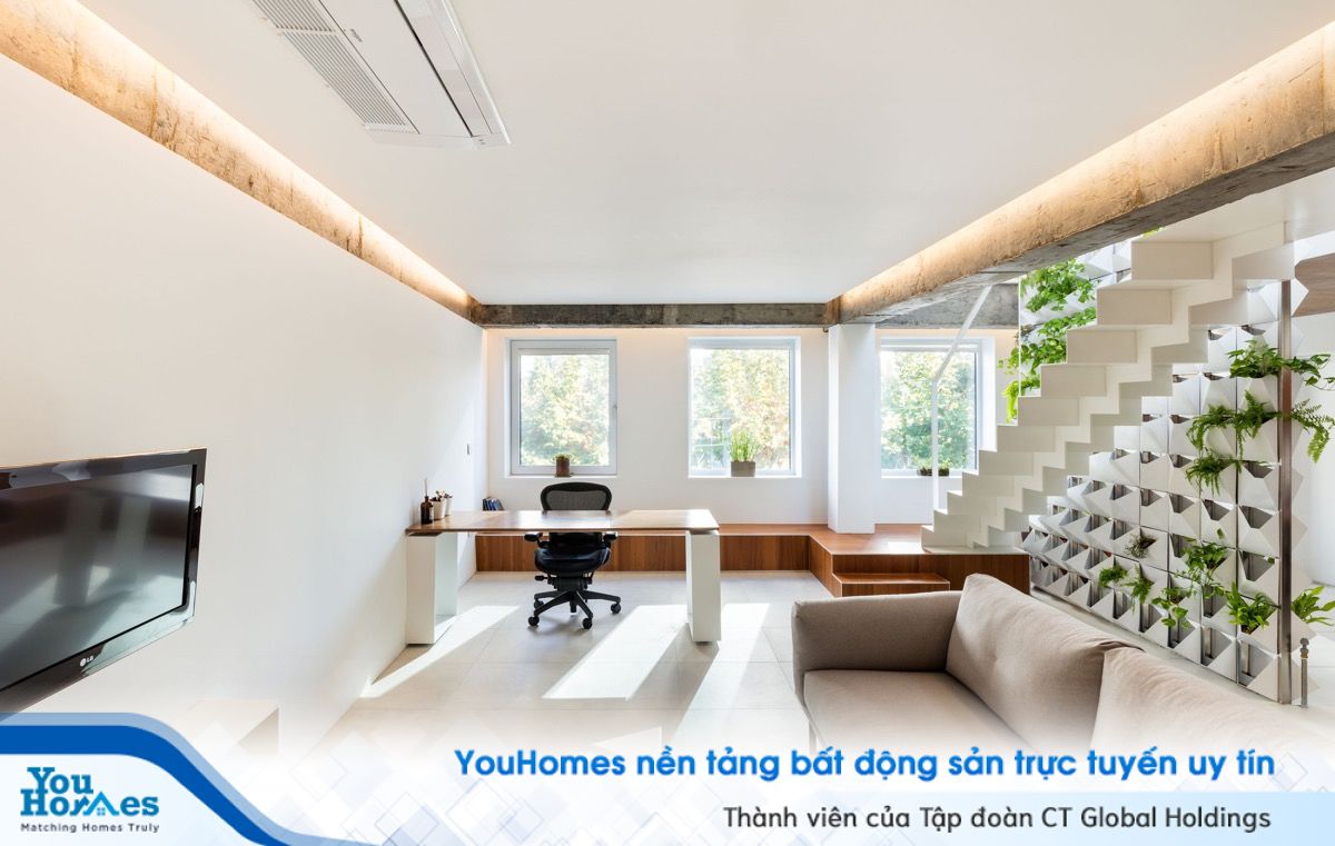 Có một không gian làm việc tại nhà nằm ở một bên của khu vực sinh hoạt chính, nơi một cái bàn đứng ở một góc bên phải so với tường tivi.