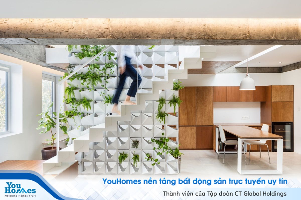 Thiết kế cầu thang rất tối giản có lan can kim loại sơn tĩnh điện màu trắng đơn giản, giúp leo lên toàn bộ chiều cao của cầu thang đi lên mà không cần thêm trục chính.