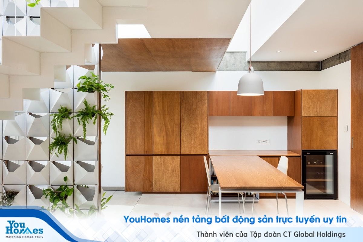 Một phòng ăn nằm trên cùng một bức tường với cửa ra vào nhà, với thiết kế gỗ ấm áp mộc mạc, bên cạnh là một bộ làm mát rượu tích hợp.
