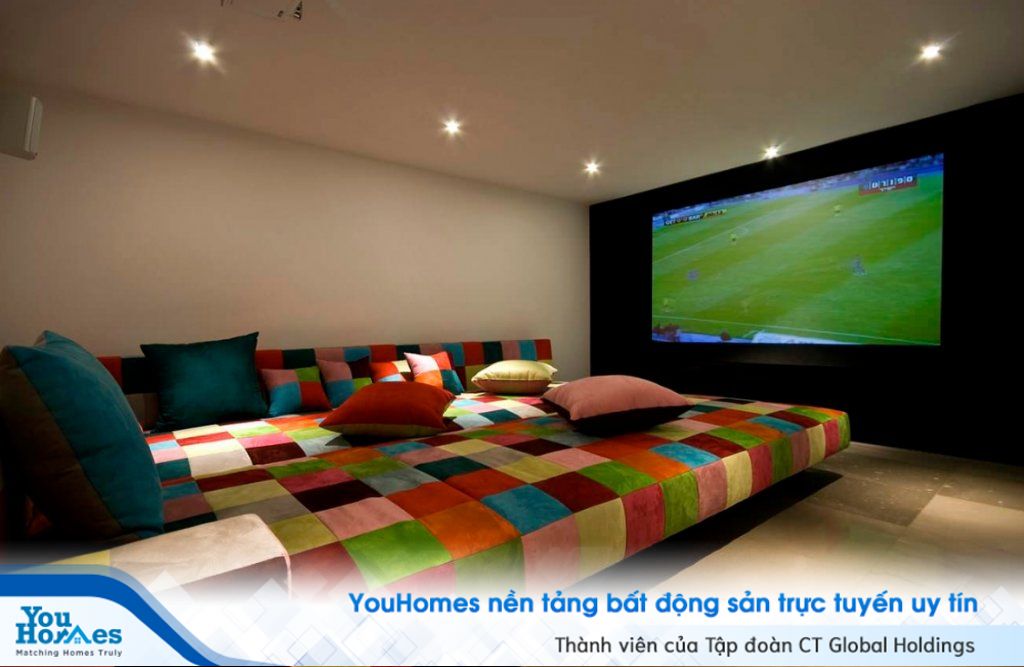 Nếu không gian nhà bạn có chỗ cho một rạp chiếu phim mini tại nhà, thay vì sử dụng ghế ngồi, bạn hãy thiết kế một chiếc giường cỡ lớn, thoải mái xem phim cùng với các thành viên trong gia đình.