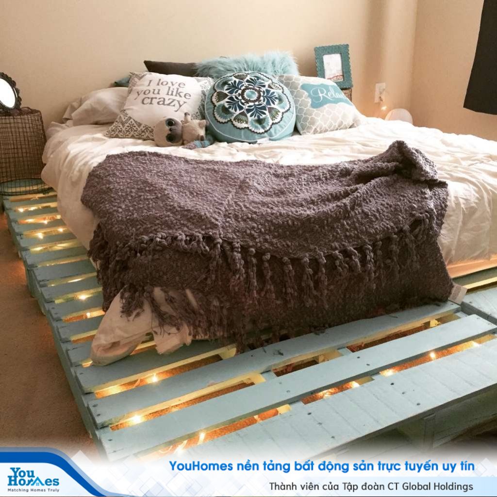 Có ngân sách hạn hẹp, bạn cũng có thể hoàn toàn thiết kế được một chiếc giường khổng lồ giành cho cả gia đình bằng cách tái sử dụng những thanh pallet. Bạn có thể dùng thêm đèn Led hoặc sơn để trang trí.