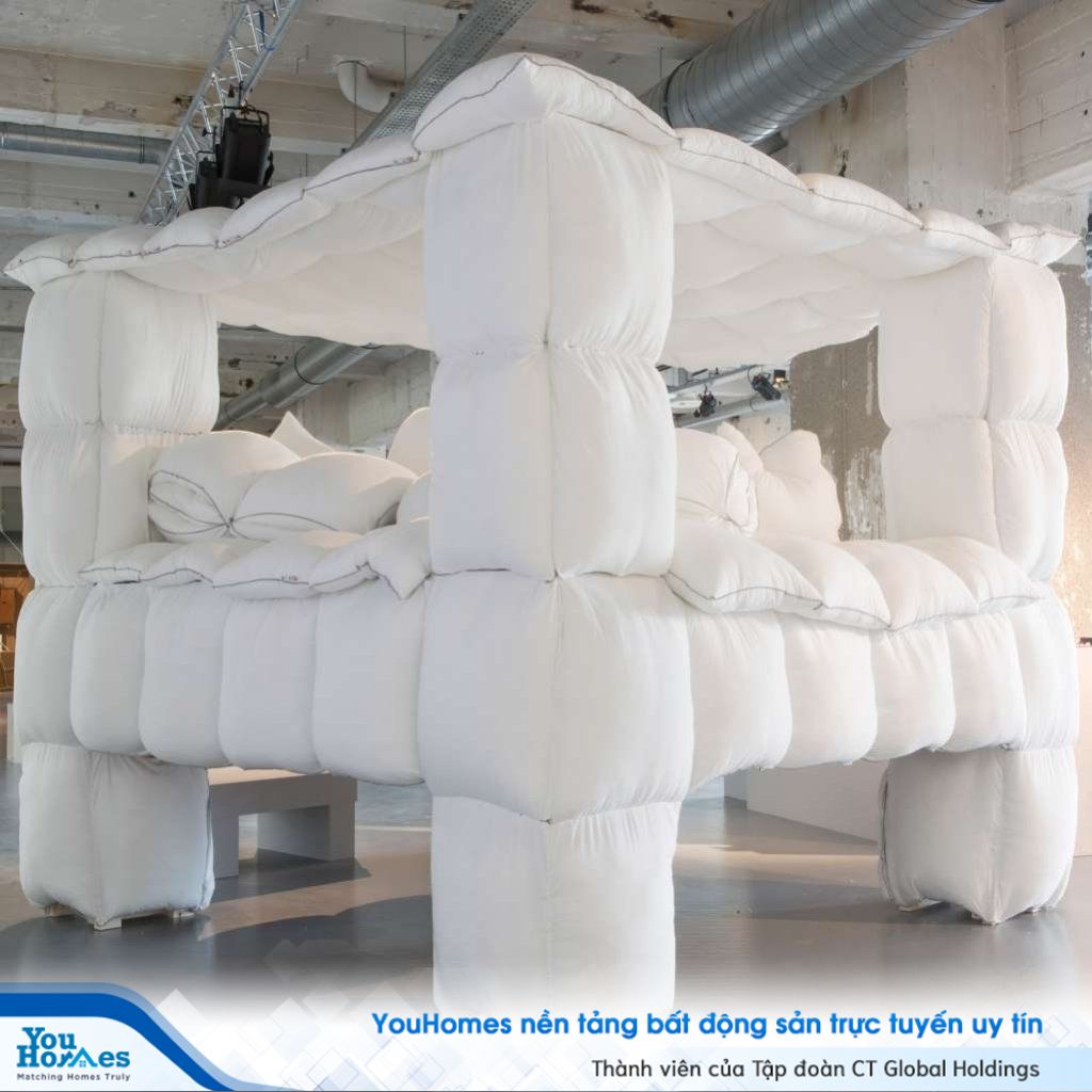 Chiếc giường này được hình thành với gần 200 trăm gối và tượng trưng cho sự gợi cảm một cách ấm cúng.