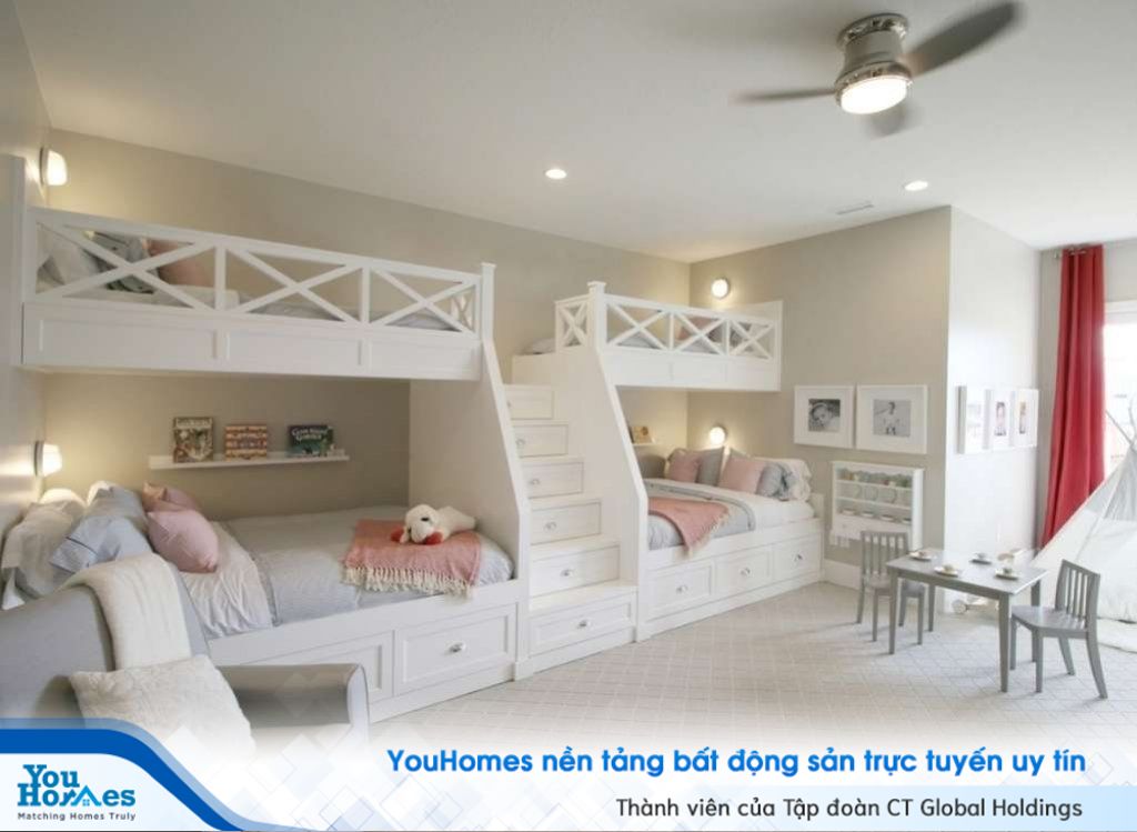 Khung giường tầng này có bốn giường lớn được tích hợp thành một, cùng với rất nhiều ngăn kéo lưu trữ.