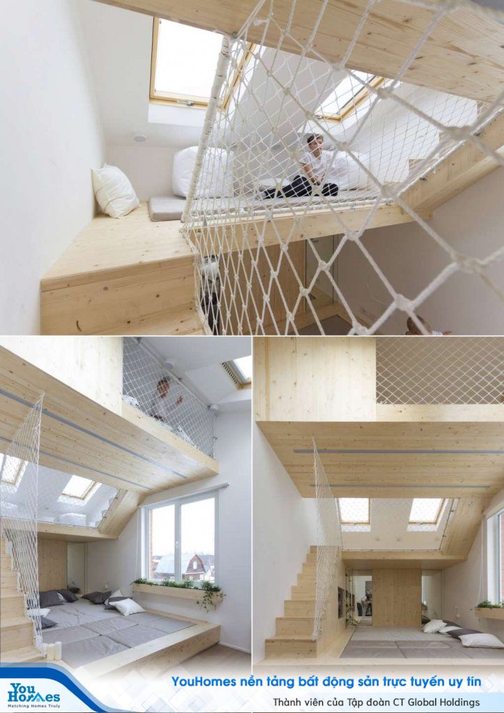 Giường này có hai cấp độ. Tầng thấp hơn có một chiếc giường thoải mái với gối. Tầng trên có một cái võng vui nhộn và một chiếc giường khác, cùng với một khu vui chơi, thỏa sức vui đùa cùng bé.