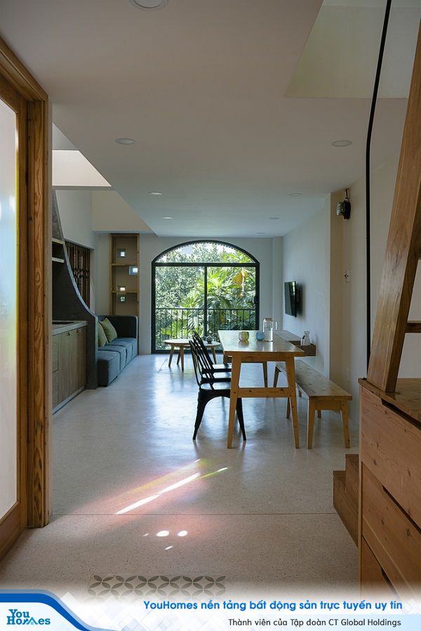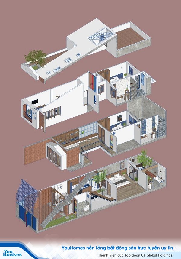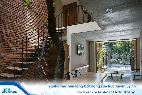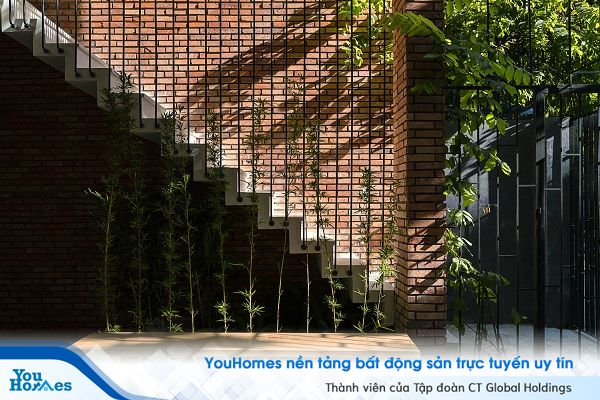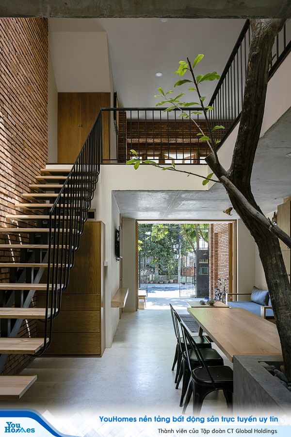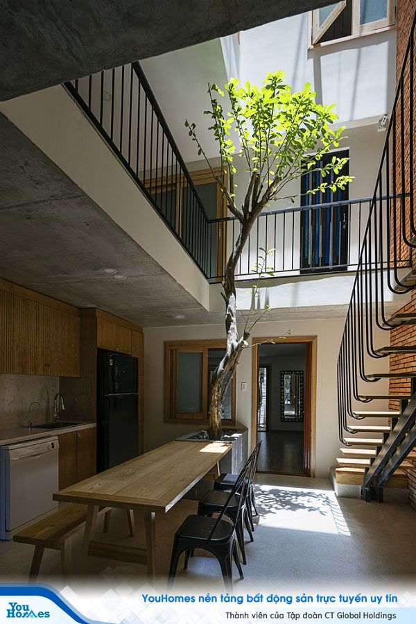 Cây xanh đóng vai trò không thể thiếu trong ngôi nhà. Nó được coi là một điểm nhấn cho các không gian bên trong và tạo cảm giác thư giãn, giải phóng mặt bằng cho một ngôi nhà có diện tích nhỏ. Trên hết, những cái cây trong nhà có thể được xem là một liên kết giữa các tầng để các thành viên trong gia đình vẫn có thể nhìn thấy nhau và trò chuyện trong một không gian mở, khép kín như thế này – bạn sẽ luôn cảm thấy thoải mái trong ngôi nhà này vì các nguồn năng lượng tự nhiên kết hợp với các vật liệu thô mộc thân thiện có sẵn tại địa phương mang đến cho ngôi nhà một nhiệt độ lý tưởng và gam màu trung tính.