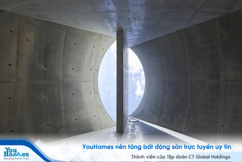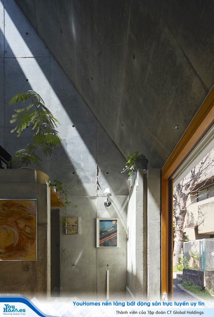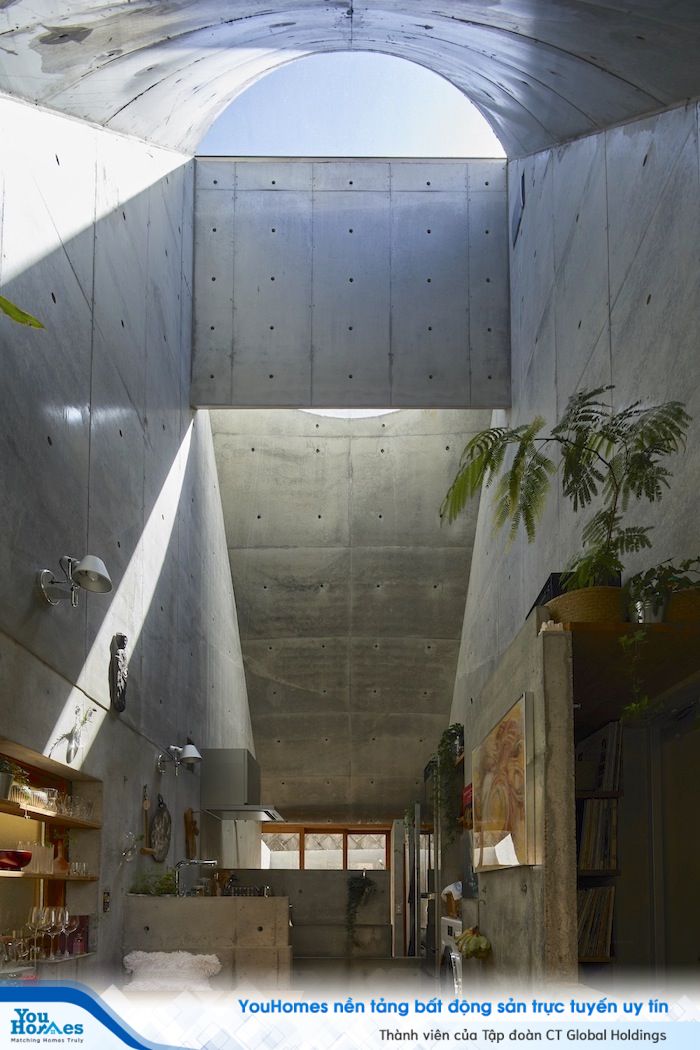 Tông màu trung tính tạo cảm giác mát lạnh trên tường và trần, giếng trời mở trên mái nhà để giải quyết vấn đề ánh sáng ban ngày.