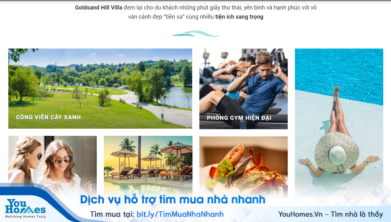 Ngoài ra, Goldsand Hill Villa cũng được đánh giá cao ở thiết kế mang đậm nét phong cách nhiệt đới – "Tropical Style" ấn tượng và những tiện ích đẳng cấp chỉ cách vài bước chân như: Bể bơi giữa khuôn viên cây xanh, khu tập gym - yoga hiện đại, spa chăm sóc sức khỏe, hệ thống nhà hàng đặc sắc, bar & lounge sang trọng, ...