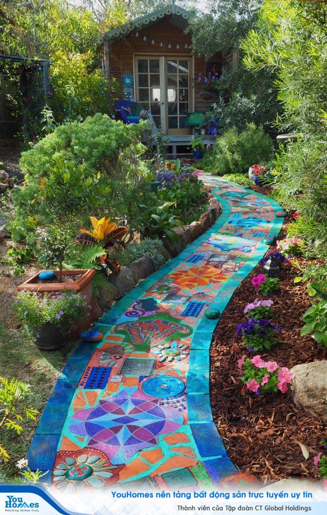Thiết kế lại lối đi trong vườn với gạch sơn, gạch vỡ, đồ sứ tái chế, đá và đá cuội.