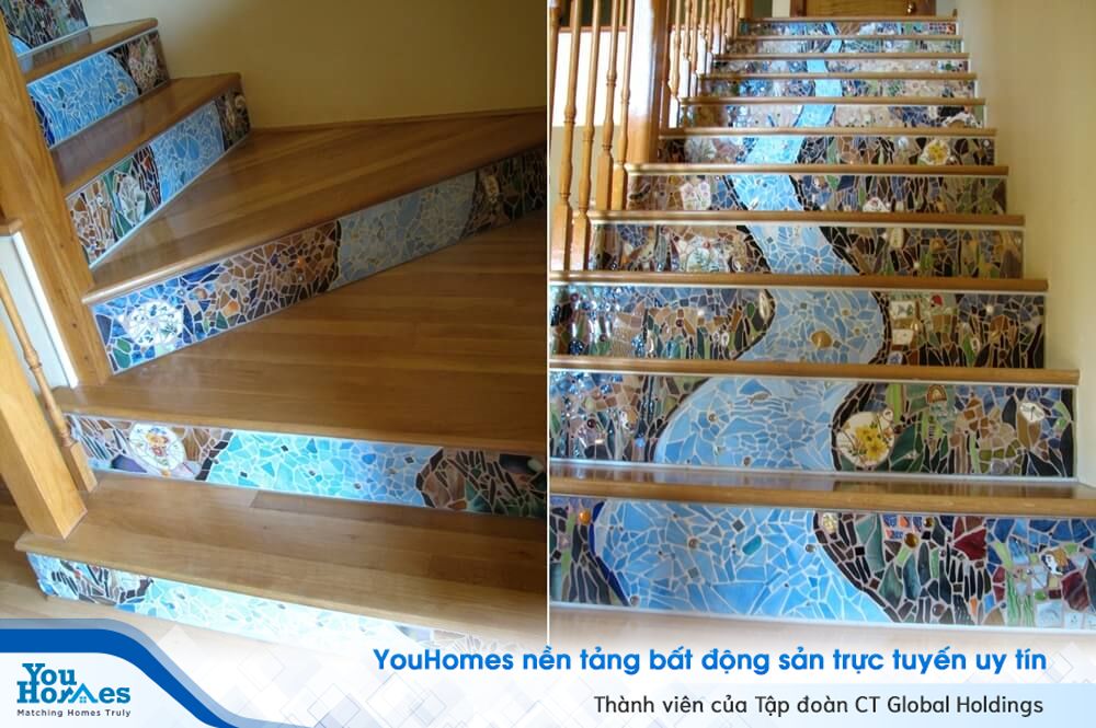 Cầu thang hoàn toàn khác lạ với trang trí đầy tính nghệ thuật từ những mảnh ghép gạch, đá màu sắc.
