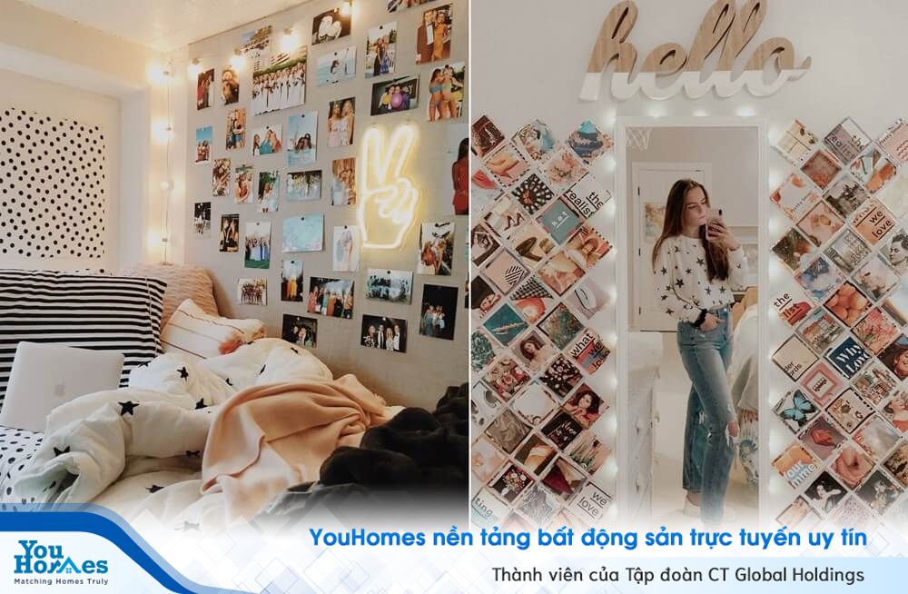 Kết hợp thêm dây đèn led cùng những bức hình trang trí cho tường thêm lung linh.