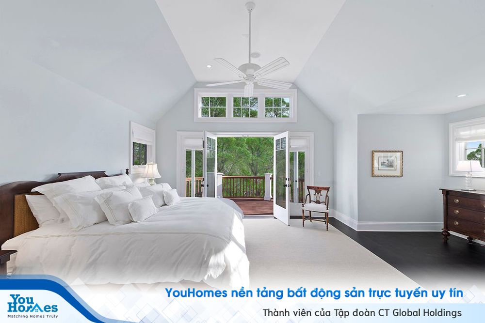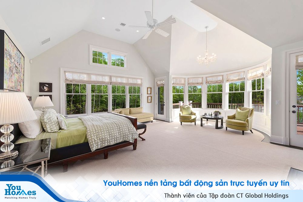 Phòng ngủ chính thoáng đãng, mát mẻ với những ô cửa sổ rộng lớn, được trang bị đầy đủ, và có riêng một không gian tiếp khách hình bán nguyệt.