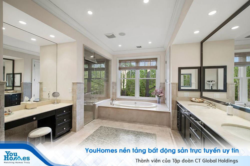 Phòng tắm chính rộng rãi, được lát gạch men màu be, có đầy đủ bồn tắm, vòi sen, và cả bàn trang điểm chuyên dụng.