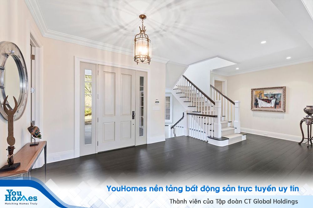 Một tiền sảnh lớn dẫn đến một phòng khách với lò sưởi bằng đá cao chót vót và một phòng ăn riêng.