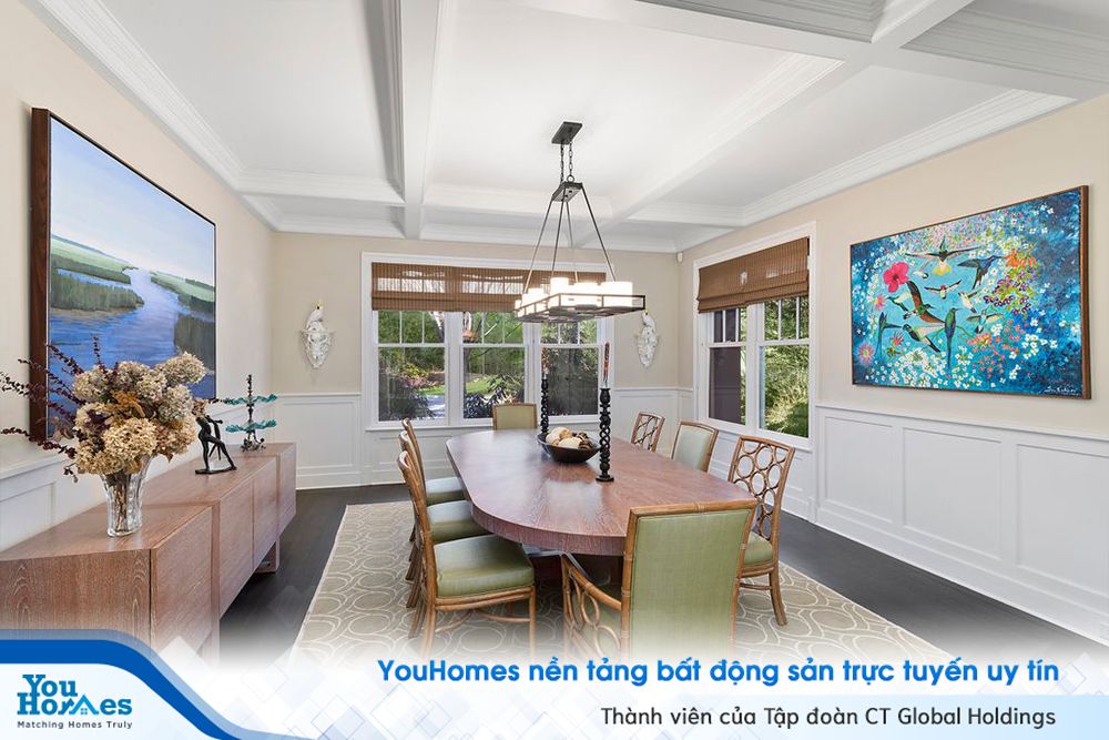 Phòng ăn lớn sang trọng được trang trí bằng những bức tranh nghệ thuật.