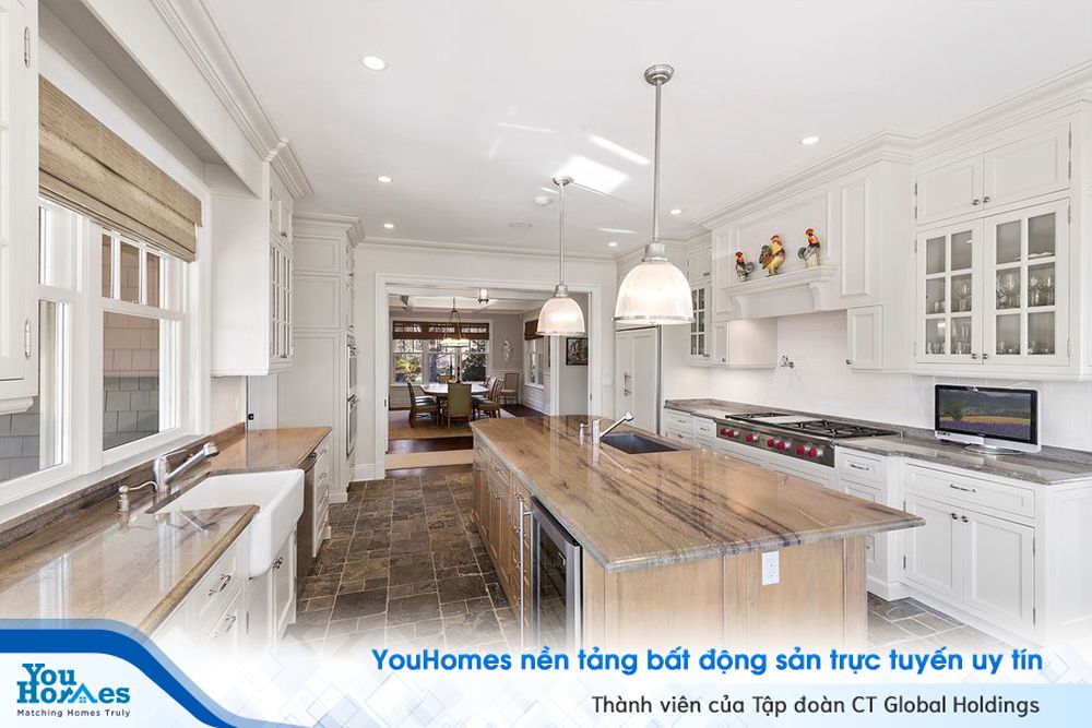 Nhà bếp cao cấp với tông màu trắng chủ đạo cùng những trang thiết bị đắt tiền, đồ nội thất được làm từ gỗ và đá granite.