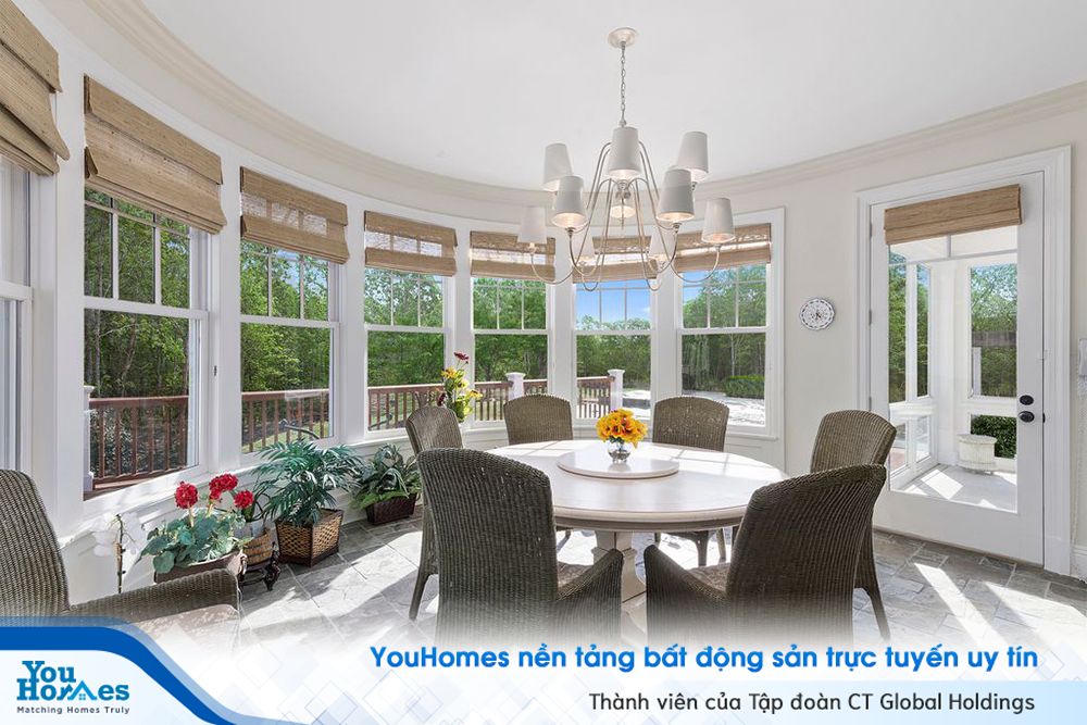 Khu vực ăn sáng tràn ngập ánh sáng tự nhiên nhờ vào các ô cửa sổ. Ở đây còn có cửa dẫn ra ban công để ngắm cảnh sân vườn.