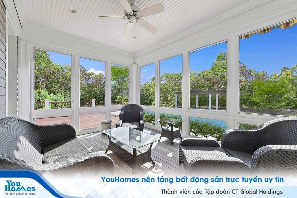 Hiên nhà cũng có những tấm cửa kính là nơi mà cả gia đình có thể tận hưởng những phút giây thư thái khi ngắm cảnh sắc thiên nhiên.