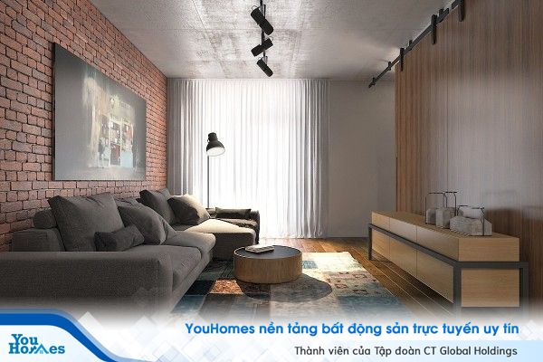 Sắc xám trung tính được sử dụng trong căn phòng với trần bê tông, ghế sofa nhưng căn phòng vẫn tạo được sự ấm áp với sàn và nội thất bằng gỗ.