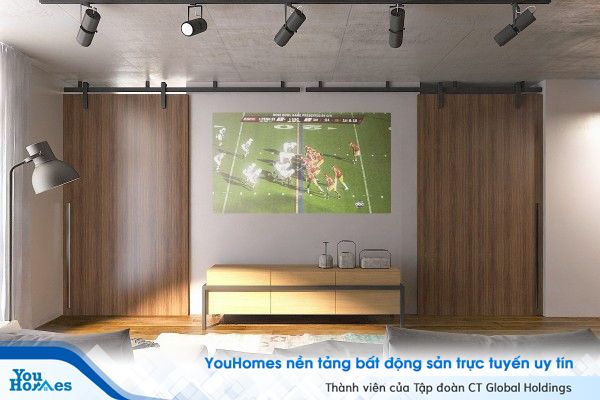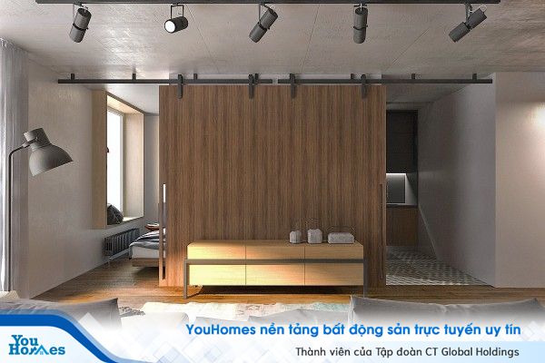 Tấm gỗ trượt có thể giấu tivi và ẩn bên trong là không gian phòng ngủ và nhà bếp. Đây là một thiết kế tuyệt vời, một trong những thiết kế nội thất thông minh để phân chia không gian sống trong các căn hộ studio.