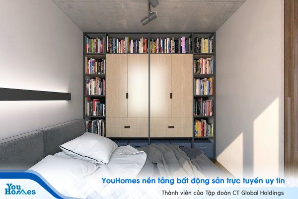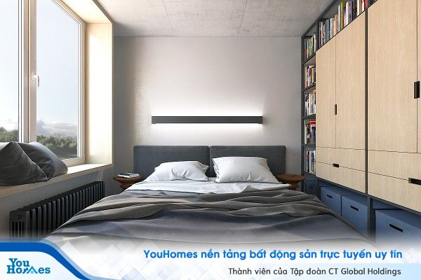 Phòng ngủ được thiết kế không gian thoáng đáng, và có nhiều không gian lưu trữ tại các ngăn tủ trên tường. Gam màu trắng xám của chiếc giường làm cho phòng ngủ toát lên vẻ hiện đại và sang trọng hơn.