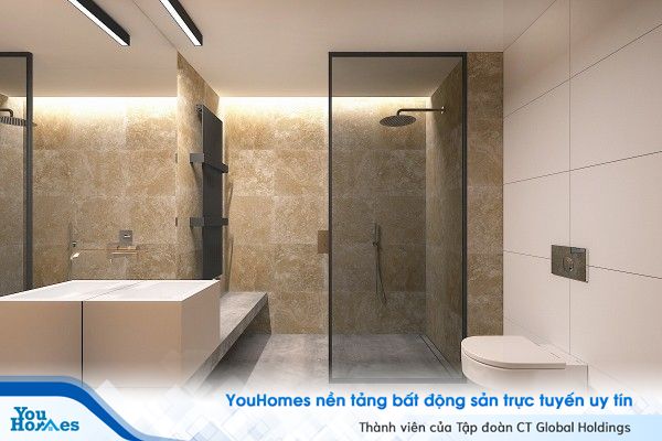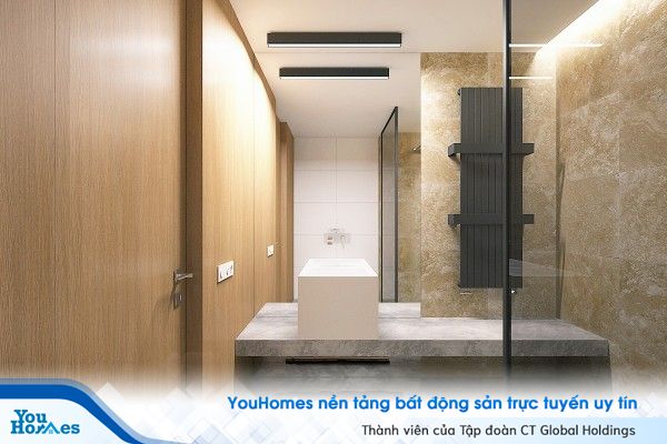 Không gian phòng tắm sang trọng, hiện đại. Một tấm thảm sọc với màu sắc tự nhiên giúp phòng tắm nổi bật so với phần còn lại của ngôi nhà.