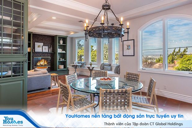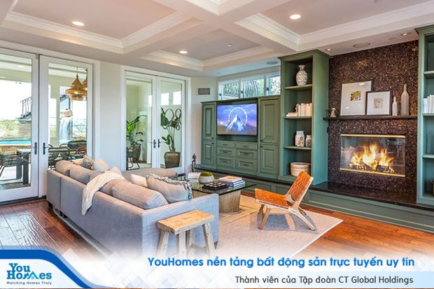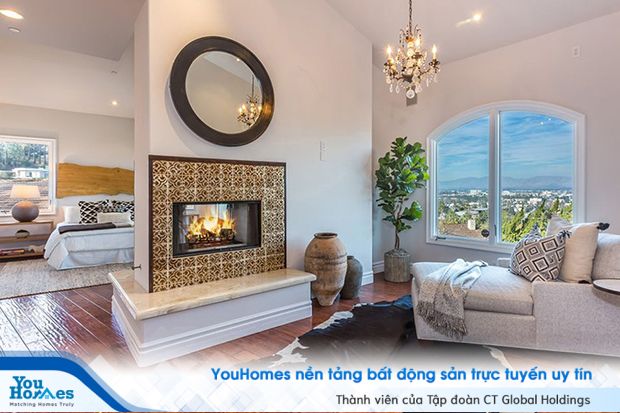 Chi tiết trang trí với những chiếc ghế nhung sang trọng, một tấm thảm có hoa văn phong phú và lò sưởi làm cho không gian sống này thêm lôi cuốn.
