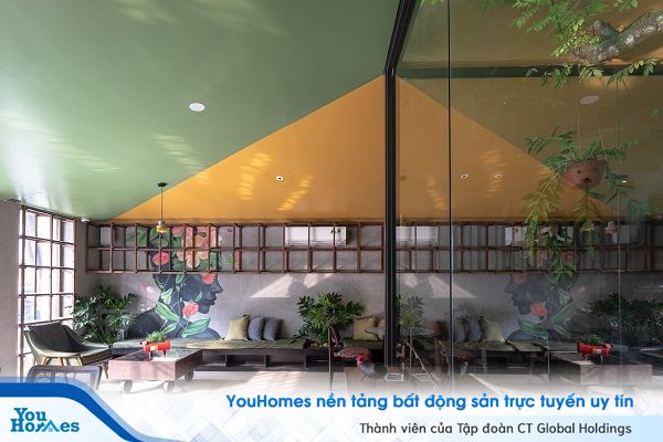 Tầng 1 là không gian quán café, quầy tiếp tân, phòng chờ dành cho khách đặt thuê phòng, tại đây cũng có nhiều góc không gian décor mảng xanh bao quanh.