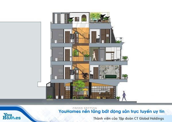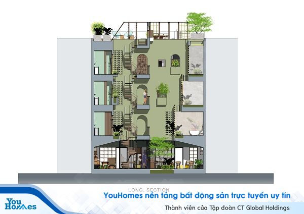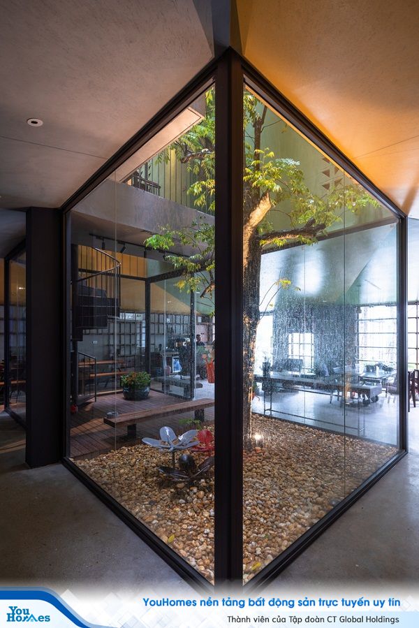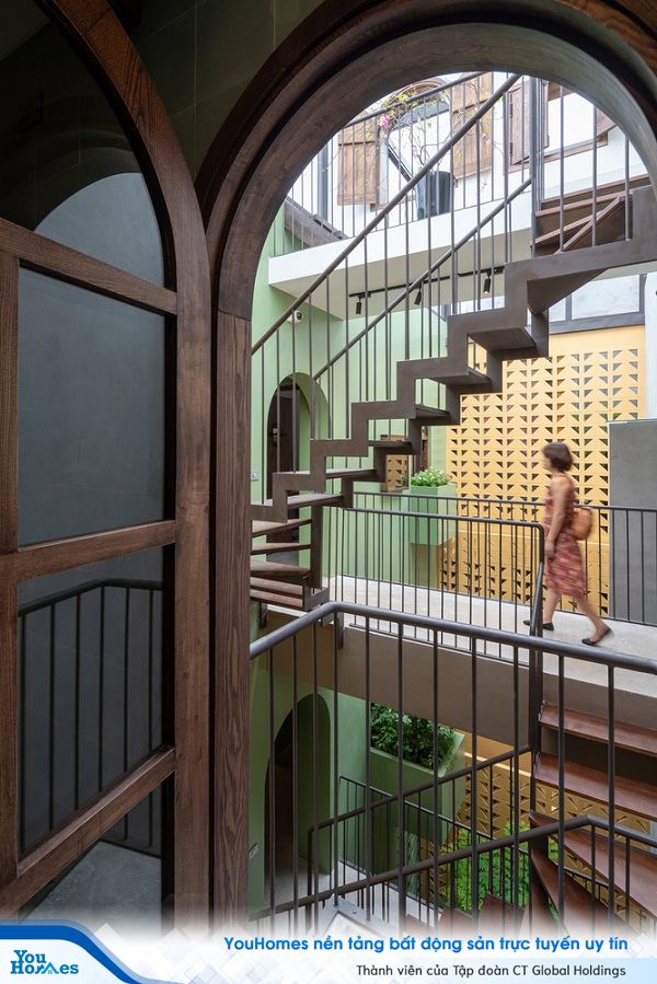 Mỗi tầng được bố trí ôm trọn giếng trời trung tâm ngôi nhà. Khoảng thông này cũng được mở rộng dọc theo cầu thang nên tập hợp nhiều không khí, ánh nắng mặt trời.