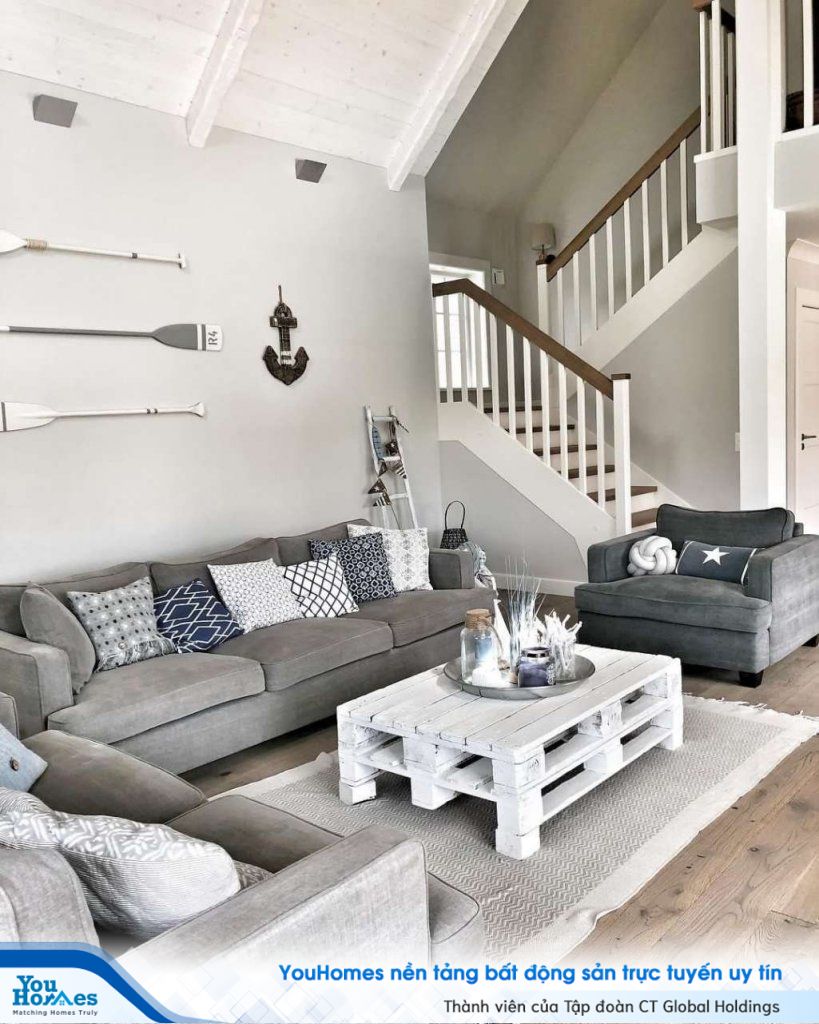 Bàn cà phê bằng gỗ tái chế với màu trắng thanh lịch. Tường phòng khách còn được trang trí thêm bởi mái chèo, mỏ neo đặc trưng của biển cả.