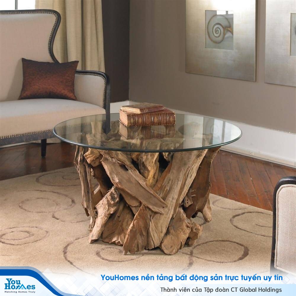 Bàn cà phê với gỗ tếch đan xen và mặt trên bằng kính vừa mộc mạc nhưng cũng không kém phần sang trọng.