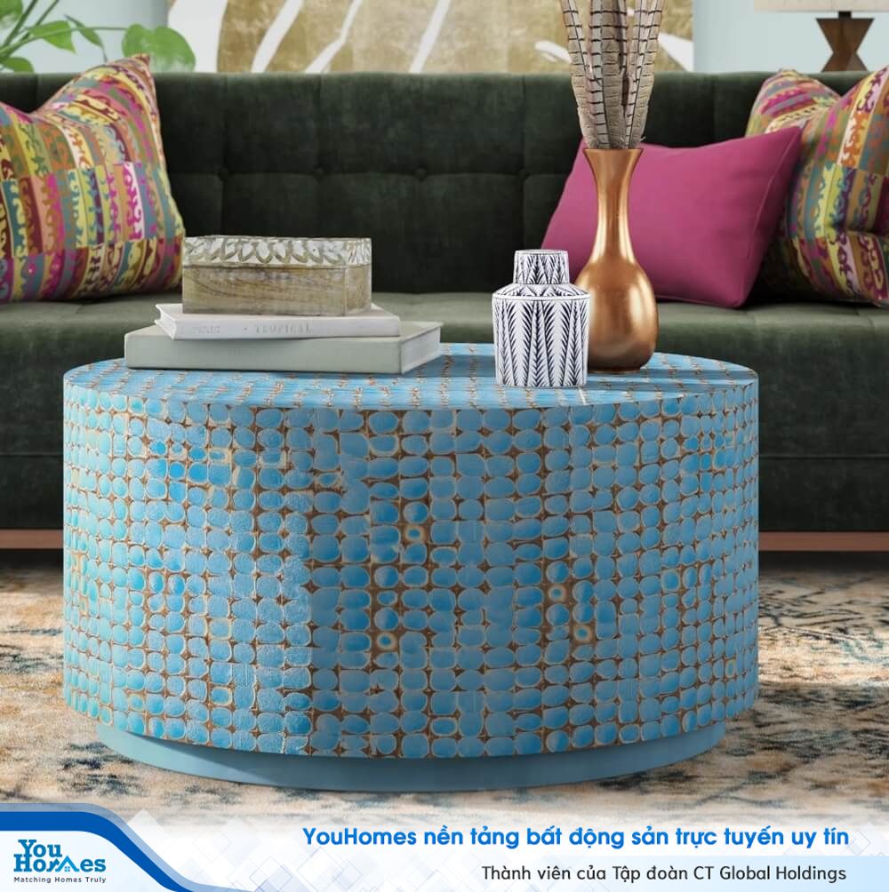 Bàn cà phê gỗ tròn đẹp nổi bật giữa không gian phòng khách.