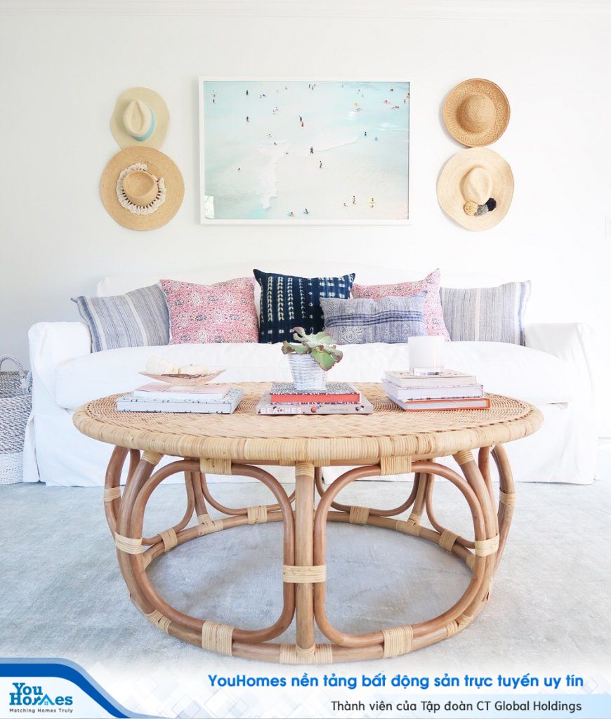 Bàn cà phê đan bằng liễu gai với hoa văn tròn, đơn giản mộc mạc thích hợp với phong cách bãi biển.