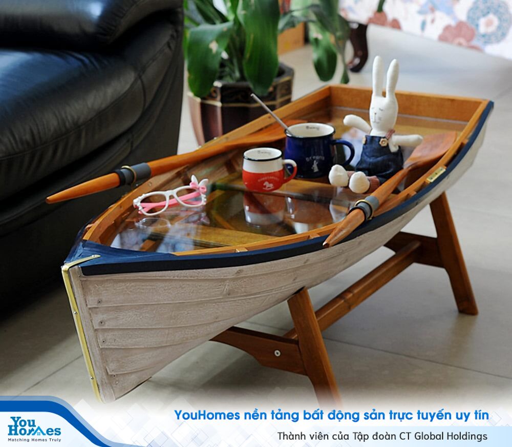 Bàn cà phê hình chiếc thuyền đẹp mắt tạo điểm nhấn ấn tượng.