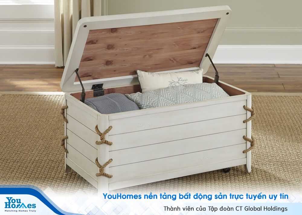 Chiếc bàn với trang trí bằng những thắt dây thừng, ẩn bên trong là không gian lưu trữ thuận lợi.