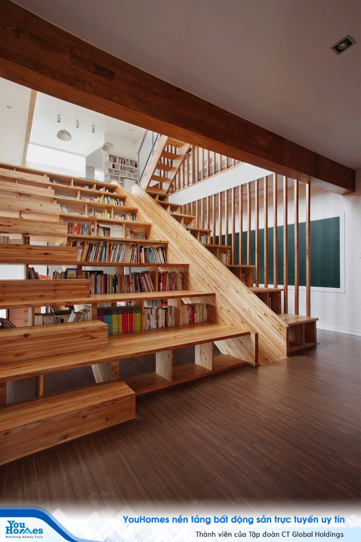 Một kiểu thiết kế cầu thang đa năng với khối lượng lưu trữ ử tầng dưới, phía dưới lắp đặt thêm bàn làm việc, kệ văn phòng tại nhà.