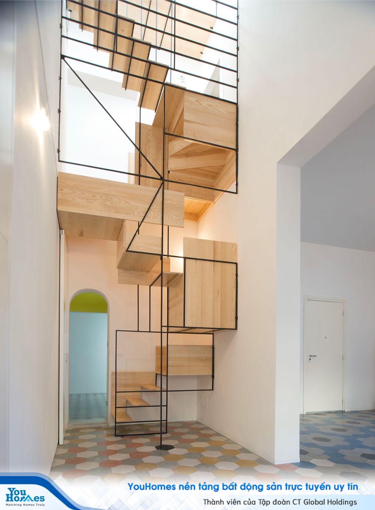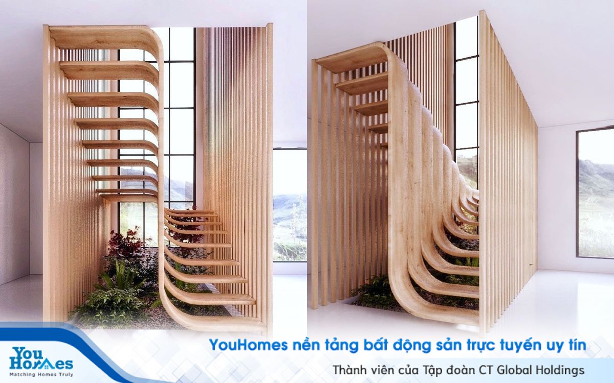 Kiểu thiết kế cầu thang tinh xảo trong không gian đơn giản, mộc mạc.