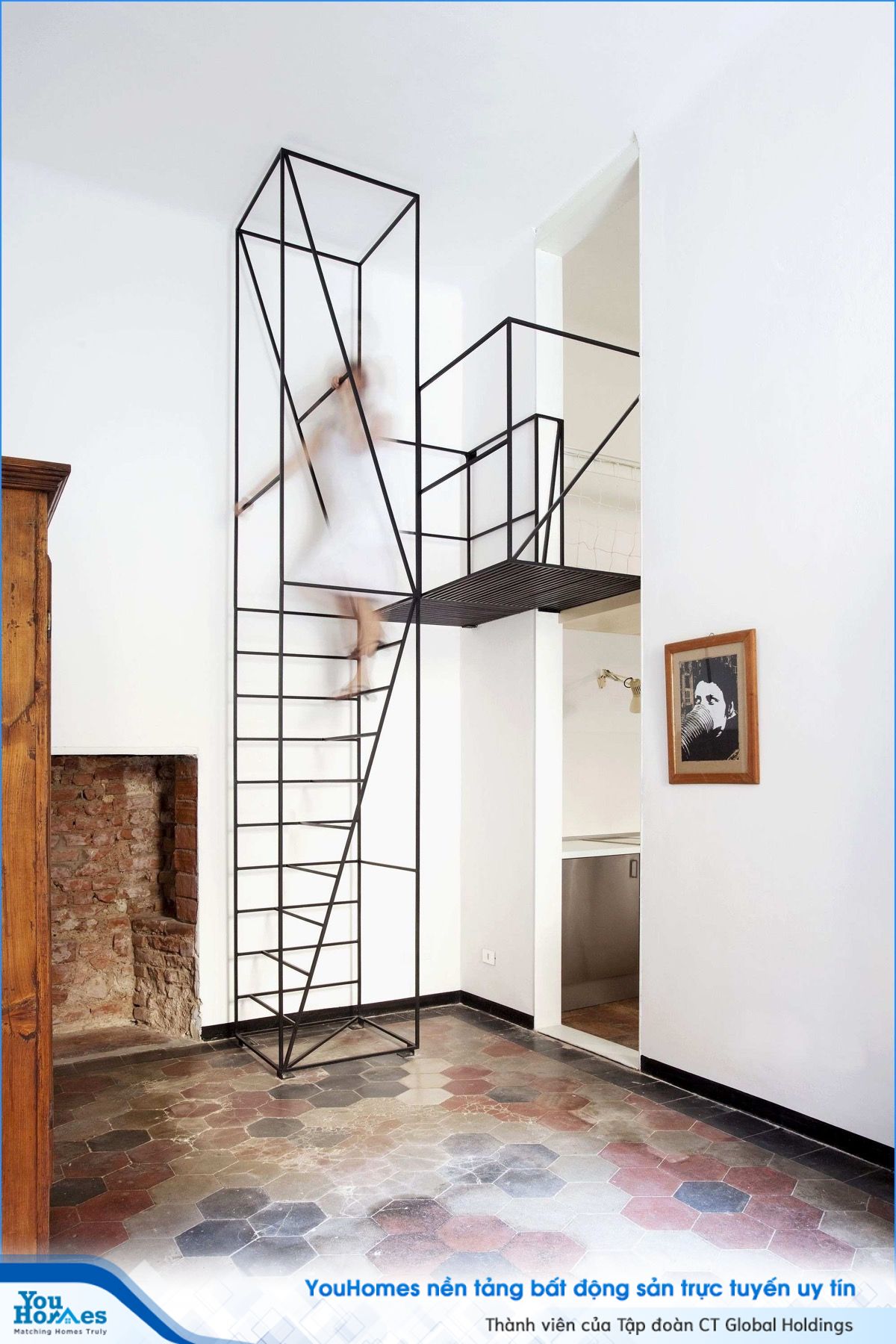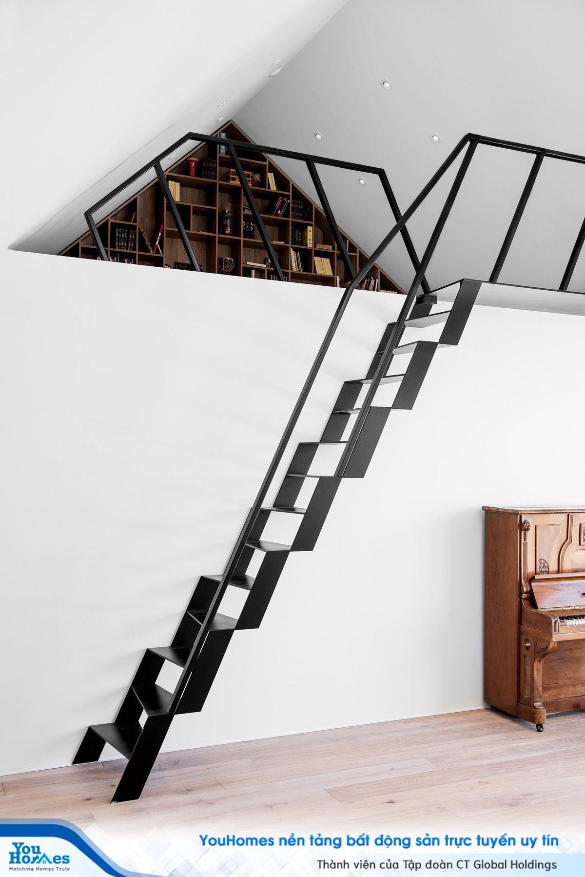 Cầu thang này xuất hiện như những đường kẻ đen mỏng trên một trang giấy trắng. Nấc thang sắt không thực sự là một điều thoải mái dưới chân, nhưng cấu trúc đơn giản thích hợp cho nhà có gác lửng và không gian hẹp.