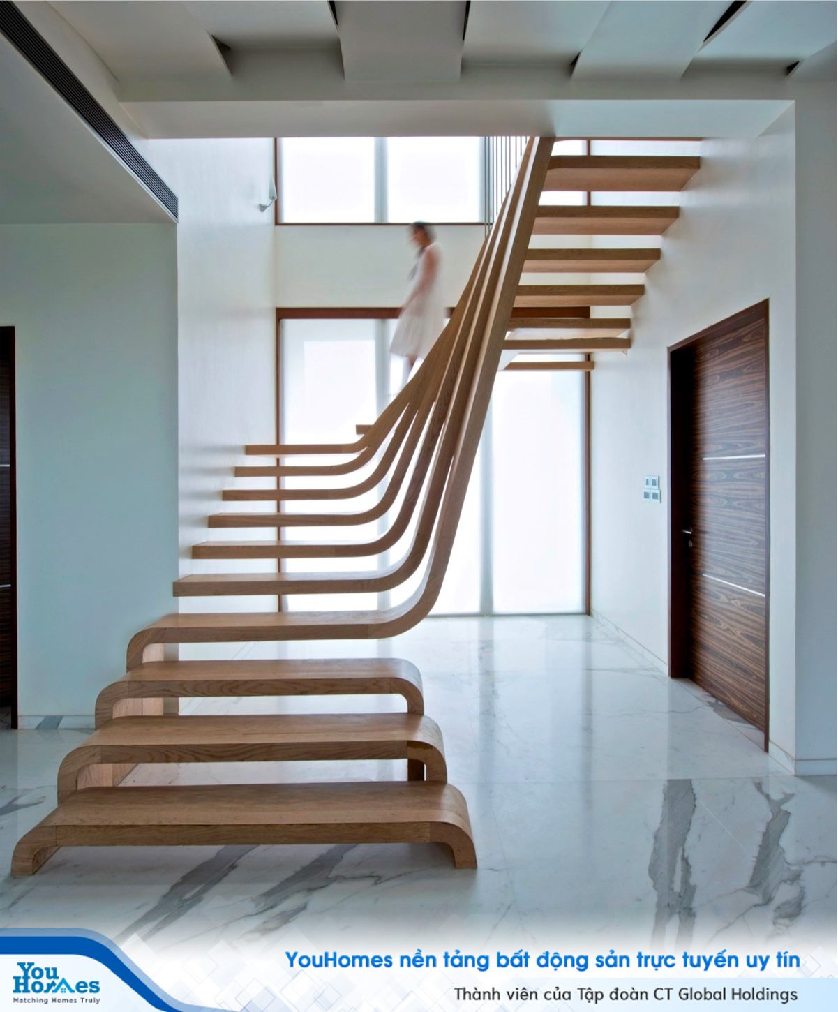 Những rãnh gỗ hình vòng cung và trượt giữa các tầng trên và dưới của cầu thang để tạo hiệu ứng tuyệt đẹp.